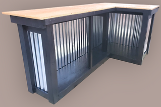 This is a beautiful 8ft L-Shaped Left in Kona stain, Burntwood with a tin face. Customer added wheels and shelves.